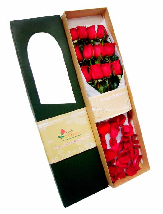 12 primorosas rosas que mi ser perfumó... Caja color verde con una docena de rosas rojas importadas.