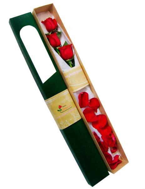 Cuánto en mi vida he soñado poderte ofrecer una rosa, que guarde bajo sus pétalos la mirada del sol brillante y que nunca pierda su aroma a fuerza de perfumar. Caja de color verde con tres rosas rojas importadas.