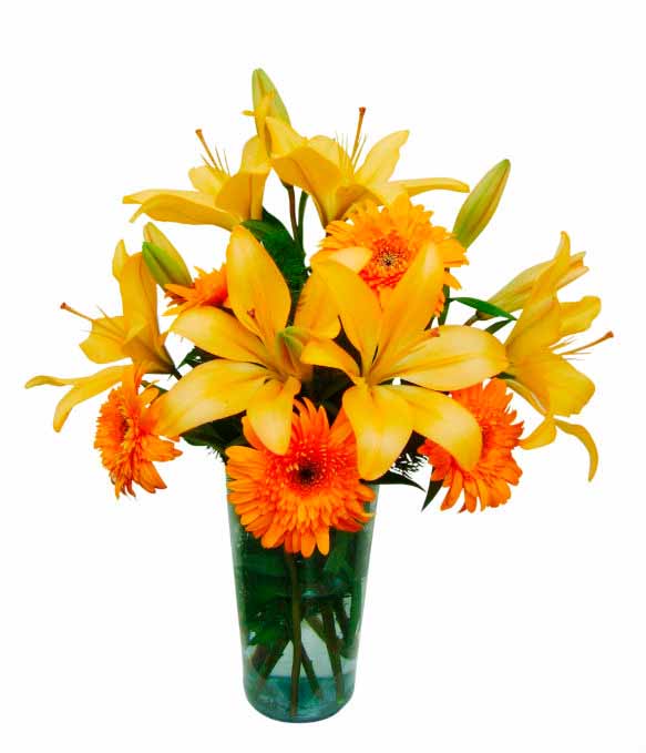 Arreglo Floral lilium, gerberas y follaje decorativo en una base de vidrio tipo florero.