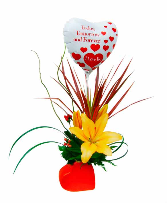 Llegamos al amor no cuando encontramos a la persona perfecta, sino cuando aprendemos a creer que una persona imperfecta es totalmente perfecta. Arreglo floral con lilium, follaje decorativo y globo en base de ceramica con forma de corazón.
