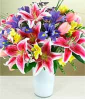 Y en el cielo infinito, en el profundo mar, en la tierra atónita dominas, ¡amor, eterno amor, alma del mundo! Florero blanco con tulipanes, lilium, iris morado y astromelias.