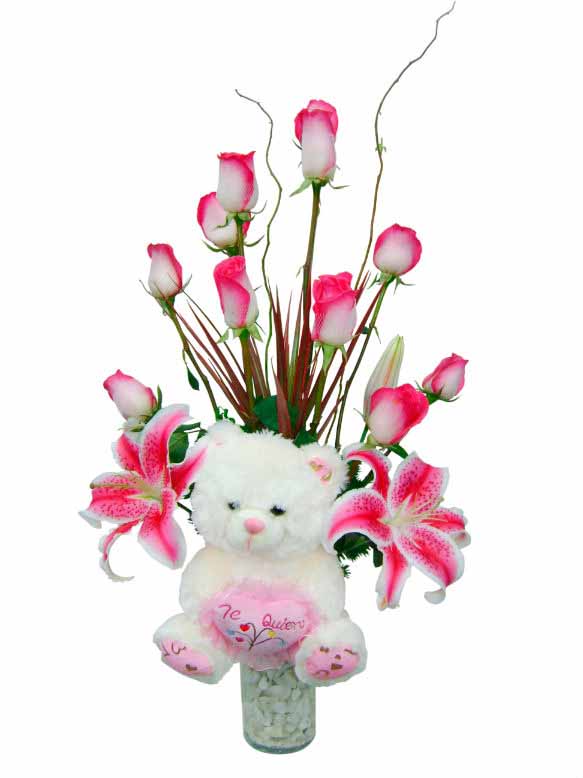 Un hombre quiere ser el primer amor de su amada. Una mujer quiere que su amado sea su último amor. Arreglo Floral con rosas importadas, lilium, peluche y follaje decorativo en una base de vidrio tipo florero.