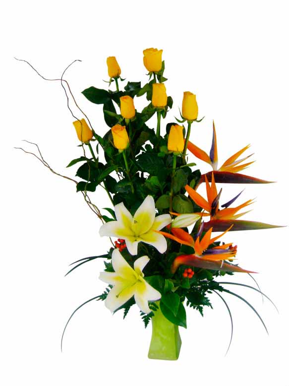 La divina magia de un atardecer, y la maravilla de la inspiración. tienes en el ritmo de tu ser, todo el palpitar de una canción. eres la razón de mi existir... Arreglo Floral Cin Rosas, Lilium, esterlicia y follaje decorativo en una base de ceramica tipo florero.
