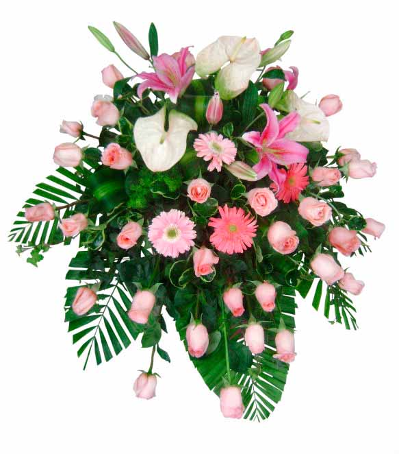 hora solo quedan recuerdos de lo que un dia fue, solo queda un triste amanecer... sin ti.. Manto con Flores Importadas Rosado Arreglo floral funebre tipo manto. Cuenta con rosas importadas, lilium, gerberas, anturios y follaje decorativo
