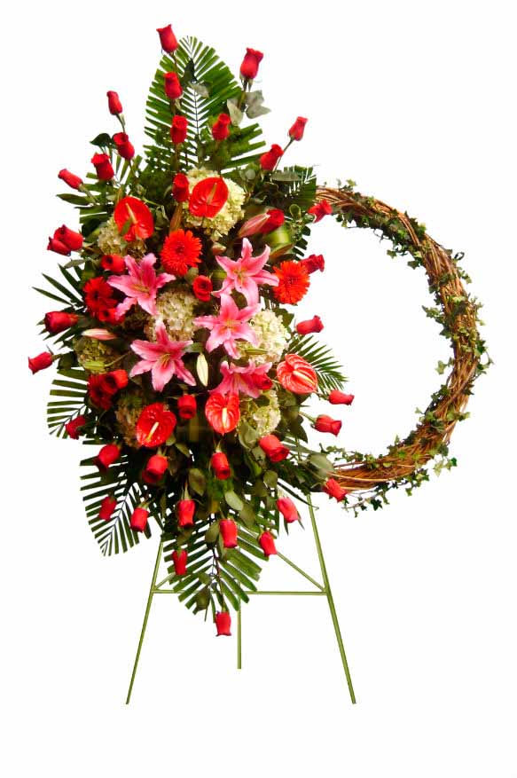 Este será el día mas doloroso después de tu partida por que... con ella te llevaras la mitad de mi corazón y de mi vida... Será apartir de ahora que mi mente se dedicará a recordarte sucesivamente... y ahi estaras por siempre conmigo... Arreglo floral funebre tipo corona con aro de mimbre y estructura de metal. Cuenta con rosas importadas, anturios, gerberas, lilum, hortencias y follaje decorativo.