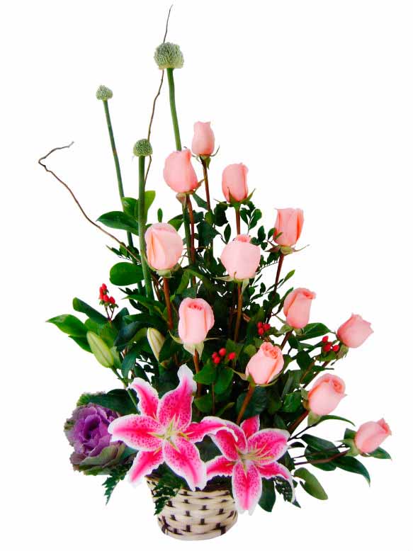 El corazón que ama siempre será joven. Te deseo un año lleno de amor y alegría. Feliz cumpleaños. Arreglo floral con una docena de rosas importadas, lilium y follaje decorativo en una base de canasta.