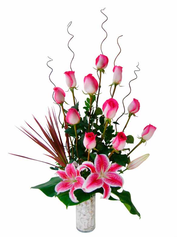 Si sumas todas las estrellas del cielo, todos los granitos de arena en los océanos, todas las rosas en el mundo y todas las sonrisas que haya habido en la historia del mundo, empezarás a tener una idea de cuánto te quiero. Arreglo Floral con rosas importadas, Lilium y follaje decorativo en una base de vidrio tipo florero.