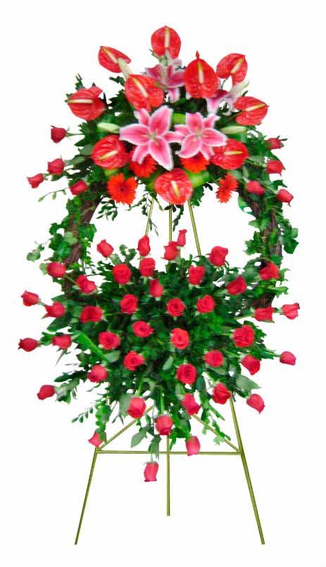 Todo cambia, cosas van y cosas vienen; quien somos nosotros para decir que se queda, solo podemos aceptarlo... Corona Flores Anturios Rojos Arreglo floral funebre tipo corona con aro de mimbre y estructura de metal. Cuenta con rosas importadas, anturios, gerberas, lilum, hortencias y follaje decorativo.