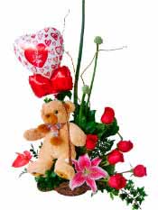 En el amor verdadero, la distancia más pequeña es demasiado grande, y sobre la distancia más larga se pueden construir puentes Canasta Rosas Peluche y Globo Arreglo floral con media docena de rosas importadas, lilium, anturio, follaje decorativo, peluche y globo en una base de canasta.